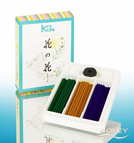 Il set di bastoncini d'incenso Nippon Kodo Hana-No-Hana è composto da 3 diversi bastoncini d'incenso à 12 pezzi, con dimensioni di 3 mm x 5,5 cm. I bastoncini d'incenso viola profumano di violetta, quelli gialli di rosa e quelli verdi di giglio. Il set contiene anche un supporto (1 cm x 1 cm) per i bastoncini d'incenso.