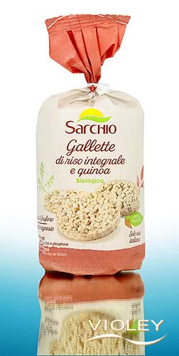 Sarchio Bio Gallette di Riso Integrale e Quinoa, senza glutine. Le cialde di riso e quinoa sono prodotte esclusivamente con chicchi di riso interi e semi di quinoa, cotti ad alta temperatura senza l'aggiunta di grassi. Sono uno snack croccante e gustoso, che può accompagnare i pasti in sostituzione del pane o essere utilizzato per preparare tartine leggere e deliziose.
