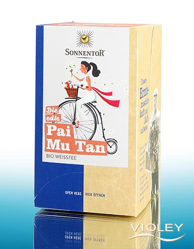 Sonnentor Pai Mu Tan. Tradotto letteralmente, Pai Mu Tan significa "peonia bianca". Il tè porta questo nome perché le foglie ricordano ai cinesi una peonia dopo l'infusione. Per il Pai Mu Tan vengono essiccati i germogli teneri e le due foglie più giovani. Il suo sapore equilibrato si abbina bene alle insalate estive leggere e ai piatti con legumi. Anche l'hummus e la zuppa di lenticchie beneficiano del suo sapore come bevanda di accompagnamento.