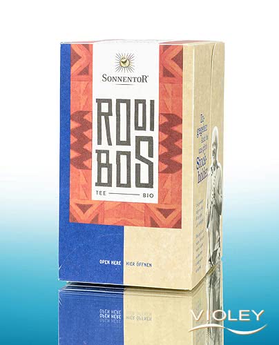 Tè Rooibos biologico Sonnentor naturale. La confezione contiene 20 bustine di tè in confezione singola. Il tè rosso ha un sapore pieno con sfumature dolci e fruttate. Lo assaggi con panna montata e miele, oppure con vaniglia o cannella.