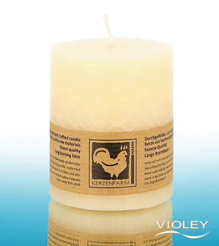 Kerzenfarm Hahn Pillar Candle Cream Cracklee 75 x 65 mm. De mooie crèmekleurige pilaarkaars met het marmerachtige oppervlak zorgt voor aangenaam licht en een sfeervolle ambiance. De kwaliteitsparaffine brandt zonder resten. Kerzenfarm Hahn gebruikt alleen geselecteerde lonten van 100% katoen.