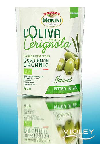 Monini Bella Di Cerignola biologische groene olijven, ontpit. Bella di Cerignola is een van de bekendste Italiaanse olijfsoorten. Het wordt gewaardeerd om zijn aangename hartige smaak: licht kruidig, met kruidige noten en een vleugje bittere amandel. Heerlijk als aperitief of tussendoortje. Deze tafelolijven zijn geraffineerd met extra vierge olijfolie, hoeven niet gepekeld te worden en zijn klaar voor consumptie in een hersluitbare verpakking. Ze zijn dus op elk moment een genot.