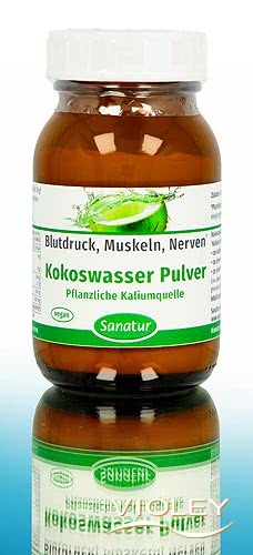 Sanatur Biologisch Kokoswater Poeder. Veel mensen kennen het water uit verse kokosnoten als een populaire dorstlesser van vakanties in tropische landen. Maar kokoswater is niet alleen verfrissend, het bevat ook zuiver plantaardig kalium. Het fijne kokoswaterpoeder kan door koud water, smoothies of voedsel worden geroerd.