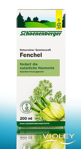Schoenenberger Bio Natuurlijk Venkelsap. Het sap wordt onmiddellijk na de oogst geperst uit verse biologische venkel. Het wordt gekenmerkt door een typisch, fijn aroma. Gemaakt zonder toegevoegde alcohol, suiker (bevat van nature voorkomende suikers) of conserveringsmiddelen.
