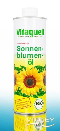Vitaquell Biologische Zonnebloemolie. De virgin, koudgeperste olie heeft een milde nootachtige smaak. Het is zeer veelzijdig en past perfect bij salades, rauw voedsel, om te koken of te stomen.