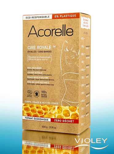 Cera Acorelle em Pérolas. A cera Royale em forma de pérola é uma cera amovível de origem 100% natural, certificada Cosmos Natural e com apenas 5 ingredientes: Resina de pinheiro, cera de abelha, óleo de rícino, manteiga de karité e um agente texturizante. Depilação para o corpo, rosto e pequenas zonas. A Cera Royale sem Tiras é fácil de retirar contra a direção do crescimento do pelo após a aplicação e secagem: Para uma depilação eficaz e permanente até 4 semanas.