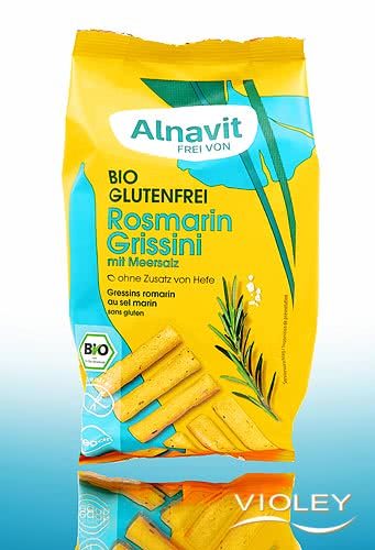 Grissini de Alecrim Biológico com Sal Marinho Alnavit. Descubra uma versão mini, sem glúten, dos conhecidos pãezinhos italianos. A fécula de batata constitui a base da massa. Complete com alecrim e sal marinho. Desfrute destes pequenos palitos como um snack de festa com um molho salgado, com vinho e queijo ou simplesmente a partir do saco.