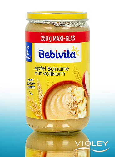 Bebivita Biológica Maçã e Banana com Farinha Integral. Neste preparado de fruta, a maçã e a banana encontram-se com o trigo integral e os flocos de aveia integral. De sabor suave e sem adição de açúcar (os ingredientes contêm naturalmente açúcar). Como lanche a partir do 6º mês.
