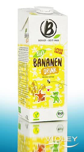 Bebida de Banana Biológica Berief. Indulgência cremosa com aveia integral, puré de banana e sementes de soja. Refinado com açúcar de beterraba e sal marinho. Edição limitada. Bebida ultra-aquecida à base de aveia fermentada e soja com banana.