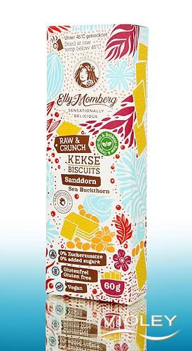Biscoitos de Espinheiro Marítimo Biológicos Elly Momberg. Deixe-se surpreender por esta fantástica criação de biscoitos com espinheiro marítimo e coco. Os seus biscoitos naturais são secos suavemente a menos de 45 °C. Uma delícia com crocância e sabor!