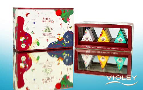 Coleção de chá biológico English Tea Shop Wellness. Experimente 12 grandes momentos de bem-estar em pleno inverno. A coleção de chá Holiday Wellness contém 3 chás biológicos aromáticos e combina o prazer festivo do chá de inverno com sabores exóticos descontraídos. Todas as variedades são de qualidade de chá a granel e embaladas em práticas saquetas piramidais de grande volume.