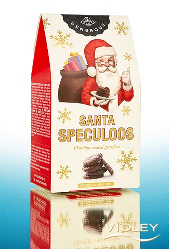 Especuloos Santa Biológicos Generosos. Especuloos delicadamente picantes com sabores invernais de canela, cravinho e cardamomo, cobertos com chocolate suave. Crocantes, aromáticos e com um delicioso toque de cacau. Um clássico que pertence simplesmente à época natalícia.