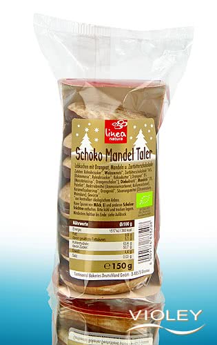 Klein und handlich sind die 8 etwa 7cm breiten und 1cm hohen Lebkuchen von Linea Natura. Eine dünne Zuckerglasur bedeckt die Schoko Mandel Taler, bei denen ich das Orangeat nur sehr schwach heraus schmecke (den Zartbitterschokoladen-Anteil dafür umso deutlicher). Ich persönlich finde den Geschmack recht angenehm und überhaupt nicht zu süß. Auch die Mischung aus Weizen- und sättigendem Dinkelmehl gefällt mir. Allerdings finde ich die Lebkuchentaler insgesamt etwas zu trocken.