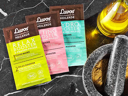 Para os cosméticos naturais Luvos, os minerais valiosos e os oligoelementos da healing earth são enriquecidos com substâncias de cuidado selecionadas e ingredientes activos naturais à base de plantas para criar composições únicas e personalizadas. As saquetas de câmara dupla dos Luvos Boosters contêm uma máscara de limpeza altamente eficaz e um concentrado eficaz para o cuidado da pele. A terra fina cicatrizante da máscara facial apoia a pele com os seus valiosos minerais e oligoelementos. A sua textura de limpeza única retém o sebo, a sujidade e o pó fino e liberta a pele até dos depósitos mais finos. Desta forma, a pele fica perfeitamente preparada para receber os concentrados de cuidados dos power boosters. Enquanto o Luvos Lifting Booster contém um concentrado antirrugas altamente eficaz com extrato de paracress, ácido hialurónico e óleo nutritivo de caroço de alperce, o Luvos Relax Booster baseia-se num concentrado relaxante com extrato de fruto de schisandra, óleo de babaçu e essências florais selecionadas. O Luvos Hydro Booster combina ácido hialurónico, extrato de algas marinhas e cafeína revigorante para formar um concentrado hidratante refrescante.