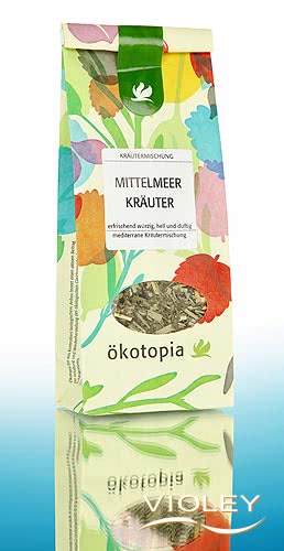 Chá de Ervas Mediterrânicas Biológicas Ökotopia. Esta mistura de ervas mediterrânicas caracteriza-se pela sua leveza refrescante. Brilhante e claro, com um sabor picante, vai colocá-lo num clima de férias no Mediterrâneo. Quer beba quente ou frio, é um prazer a qualquer hora do dia.