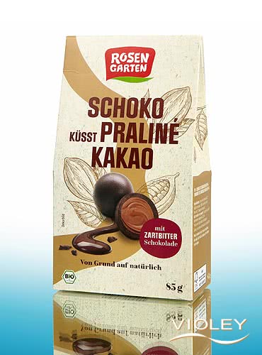 Beijos de Chocolate Biológico Rosengarten Cacau Praliné. O chocolate preto fino envolve um núcleo de creme de cacau fino. As embalagens incluem 8 pralinés que são embrulhados em papel colorido. Para todos aqueles que gostam de doces, mas também gostam de partilhar com os outros.
