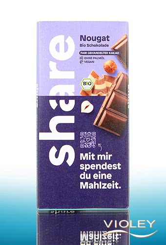 Compartilhe o chocolate biológico Nougat. Este chocolate preto vegan de nozes derrete-se literalmente na sua língua e deixa o típico sabor a chocolate de nozes. Uma óptima alternativa para todos aqueles que adoram o sabor intenso do chocolate e querem prescindir de ingredientes de origem animal.
