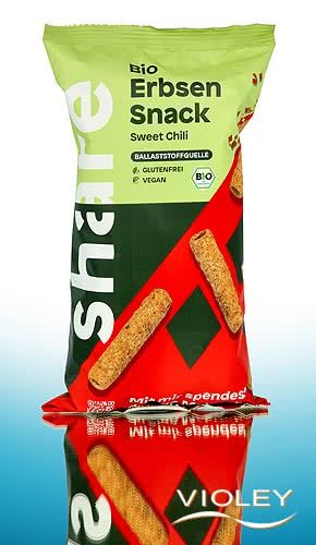Share Snack Ervilha Biológico Sweet Chilli. Diversão crocante à base de farinha de ervilha. A especiaria sweet chilli com pimenta de caiena, pimenta preta e extrato de paprika dá a estes sticks vegan o seu carácter picante. Ideal para levar para casa ou como snack entre as refeições.