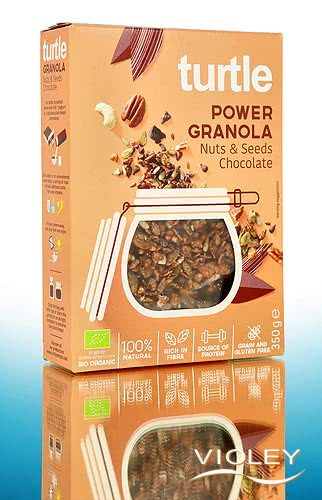 Turtle Organic Power Granola Nuts & Seeds Chocolate. Sunflower seeds, pumpkin seeds, buckwheat and linseed form the base of this crunchy mix. Coconut flakes, agave syrup, nuts and chocolate provide the irresistible aroma. Enjoy the Power Granola with milk or your favourite plant-based drink.