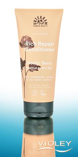 Urtekram Rich Repair Conditioner Nordic Berries. Um condicionador reparador e hidratante para cabelos normais a secos, também adequado para cabelos desidratados e danificados. Com extrato de amora nórdica que ajuda a nutrir e a refrescar o cabelo. Contém óleo de aveia condicionador, extrato de farelo de aveia e aloé vera que ajudam a proteger e a hidratar o cabelo. Uma fórmula nutritiva que ajudará o cabelo a recuperar a sua força natural, a sua suavidade, o seu brilho e a facilitar a escovagem. Com um aroma frutado e fresco.