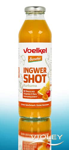 Shot de Gengibre e Curcuma Biológicos Voelkel na garrafa grande de 0,5 litros. A combinação aromática de sumo de gengibre, sumo de curcuma e pimenta com vários sumos de fruta não só impressiona pelo seu sabor frutado, acentuado e refrescante, como também fornece uma porção de vitamina C natural.