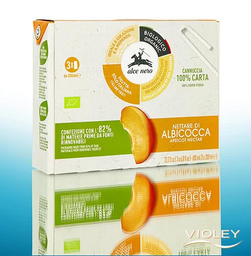 Alce Nero Organic Apricot Nectar. Fully ripe Italian apricots captured in a velvety, intensely fruity nectar. In a handy single-serve pack with a paper straw, perfect for starting the day or enjoying a fruity break.