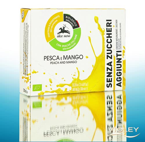 Alce Nero Organic Peach Mango Juice. Ripe Italian peaches meet exotic mango - a velvety-sweet drink with no added sugar¹ that impresses with its golden colour and tropical, fruity aroma. In a handy individual format with paper straw.