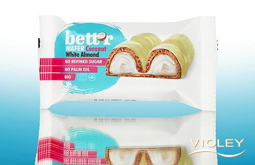 Bett'r Organic Wafer Coconut White Almond. How about a little break from everyday life? This exquisite wafer bar was created for conscious moments of indulgence. It impresses with its velvety-soft centre made from exotic coconut and fine white almonds. Embedded in wafer-thin, crispy wafer layers and coated in a creamy glaze.