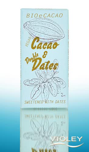 BioeCacao Organic Cacao & Double Dates. Pleasantly sweet, with a flavour reminiscent of milk chocolate and honey and a wonderfully creamy texture. With no added sugar¹, this bar is sweetened exclusively with dates.