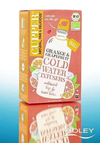 Cupper Cold Water Infusers Orange and Grapefruit. Based on rosehip, rooibos and hibiscus, this summery blend is created: The warm citrus note of orange meets the sweet-bitter note of grapefruit and brings zesty refreshment to the glass. The tea bags can simply be infused with cold water and unfold their fruity citrus aroma. For those who prefer it warm, they can also be prepared with hot water.