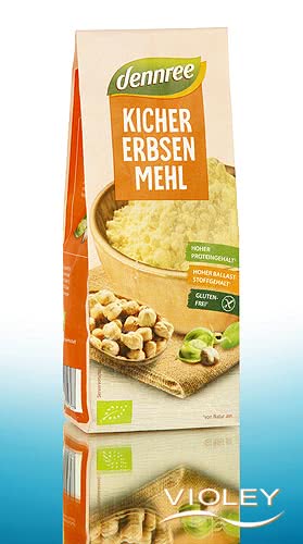 dennree Organic Chickpea Flour, gluten-free. Chickpeas are legumes and belong to the butterfly flower family. They are frequently used especially in Oriental and Mediterranean cuisine. For the gluten-free Chickpea Flour, ripe chickpeas are dried and finely ground. With its nutty-sweet flavour, it gives dishes such as falafel, pancakes, patties, flatbread and desserts an Oriental touch.
