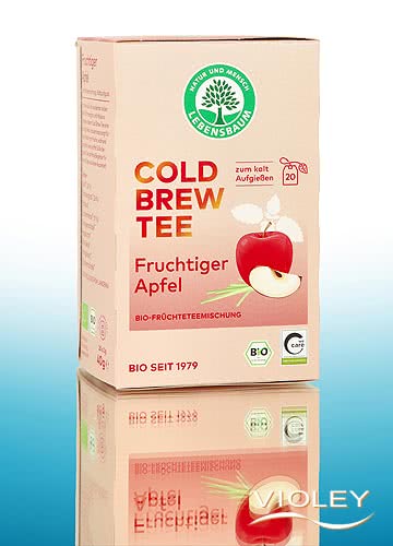 Lebensbaum Organic Cold Brew Tea Fruity Apple. Fruity-sweet and wonderfully delicious: apple, lemongrass and hibiscus give this cold brew tea a tangy flavour. Spearmint provides a hint of freshness, while honey herb adds a gentle sweetness. The perfect companion for warm days and short breaks.