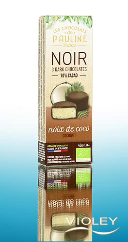 Les Chocolats de Pauline Organic Dark Chocolate Bites with Coconut. Delicate coconut covered in intense dark chocolate: these chocolates from France are a little treat for between meals. A sweet temptation to share or enjoy on their own.