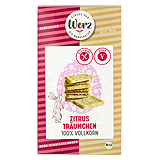 Werz Organic Wholemeal Biscuits Raspberry Coconut. Tasty wholemeal biscuits made from rice flour. With the subtle caramel flavour of mildly sweet rice syrup. Refined with freeze-dried raspberries and exotic coconut flakes.